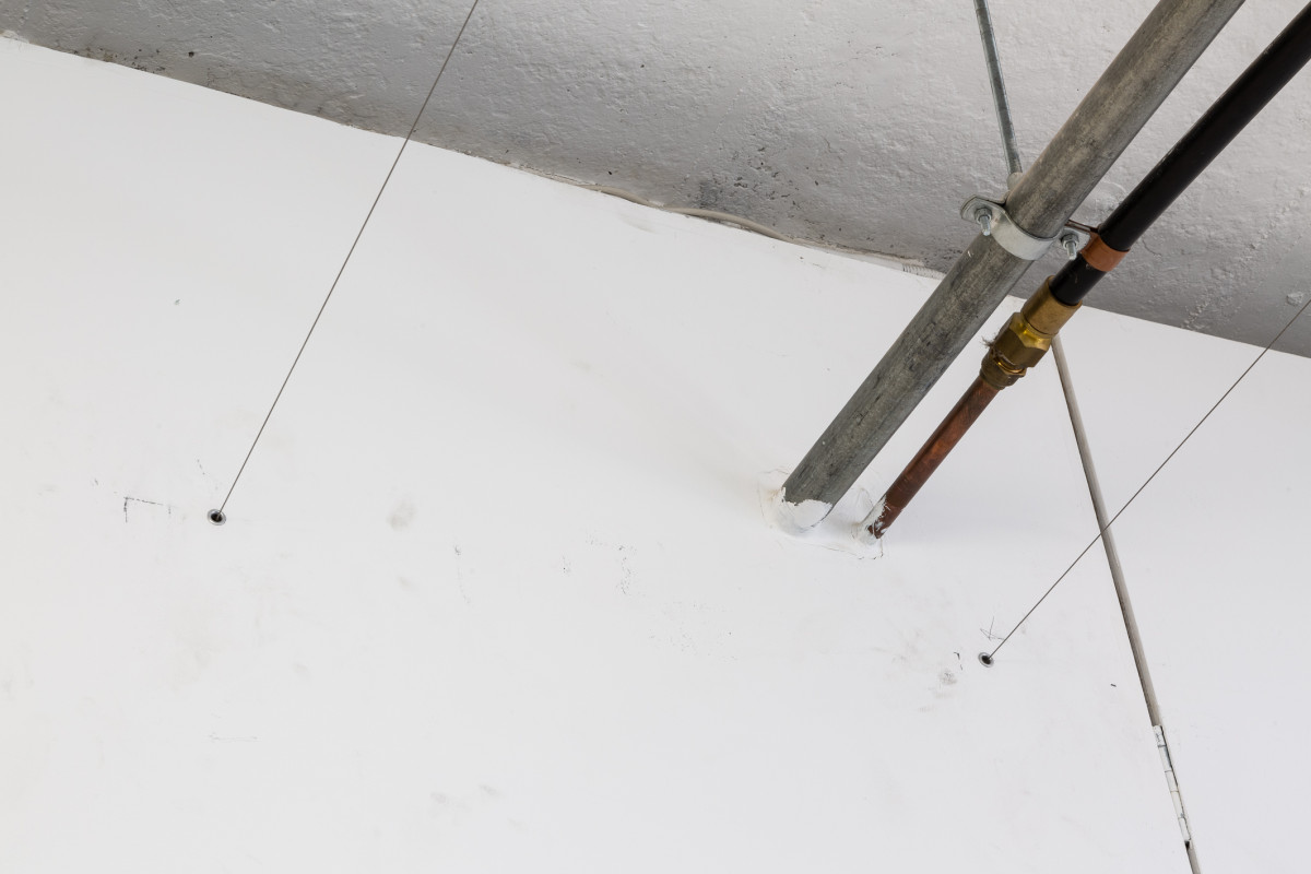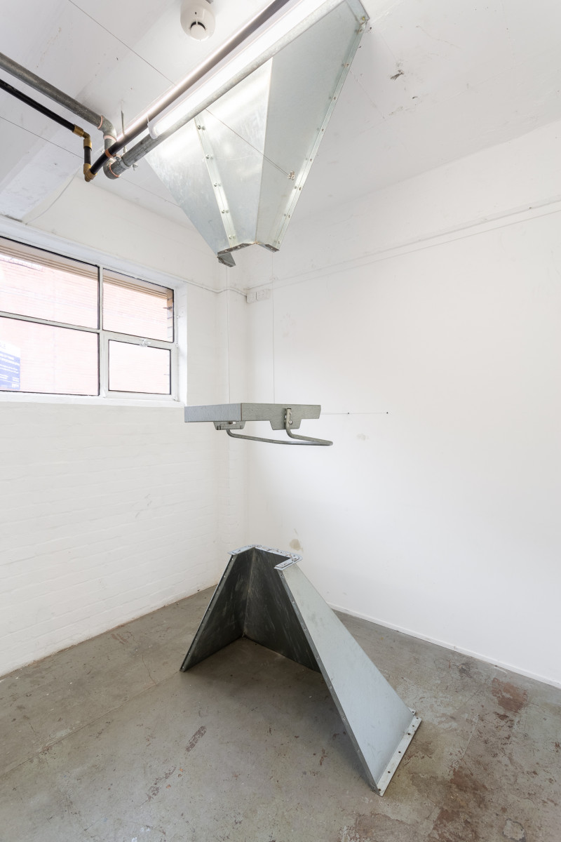 The functioning qualities of the industrial object, omnipresent within the space, blurs the line between art object and architecture, these thresholds reformatting the gallery as part of the work. The peculiar possibilities that art holds is threaded into the foundations of the building, warping the structure we assume as both reliable and stagnant. As object and building intertwine the space is reassessed, no longer receding into invisibility, dragged up for closer inspection.