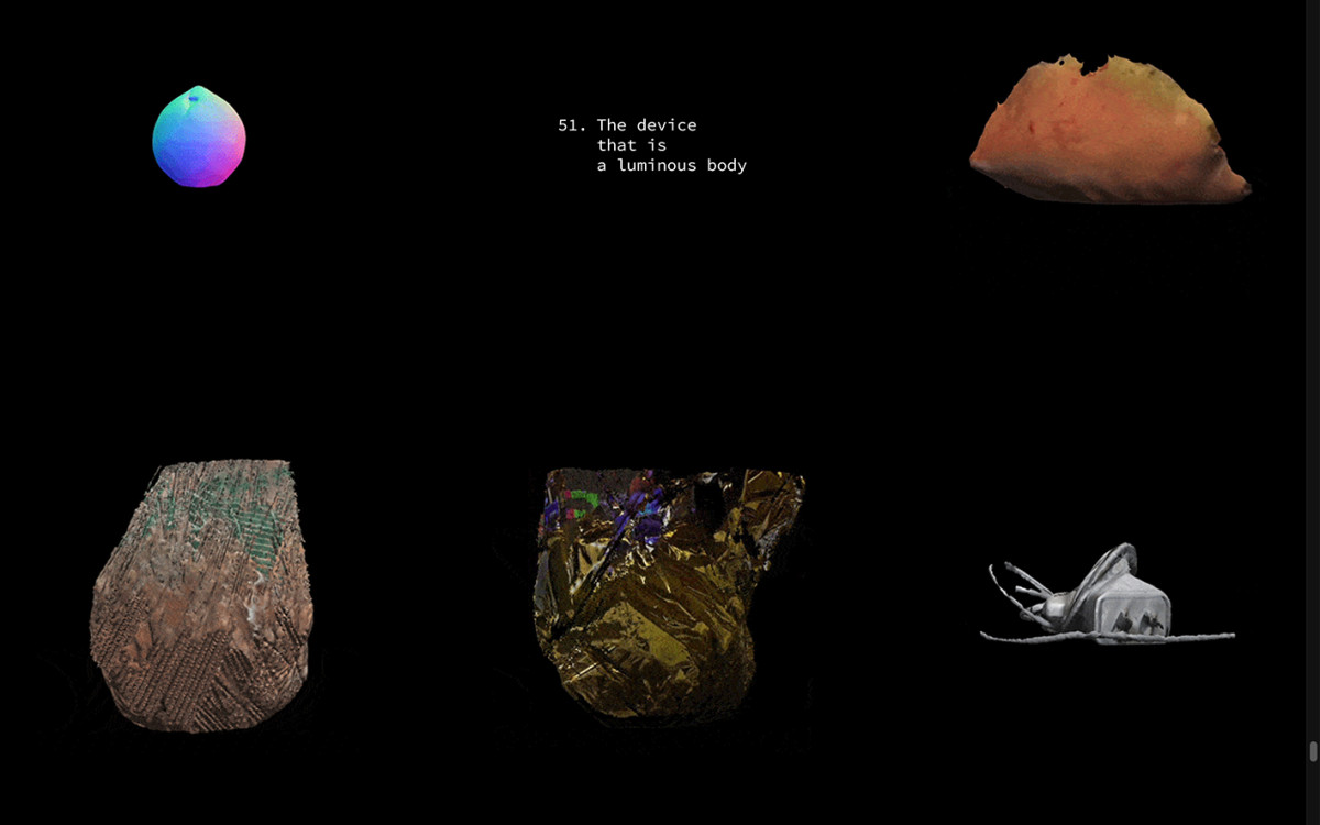 All my Chameleon Signals, 2021, is an ongoing interactive digital archive of small-scale 3D-scanned everyday objects that become meaningful through a collaborative text, written with USA-based poet Cynthia Arrieu-King and an artificial neural network.