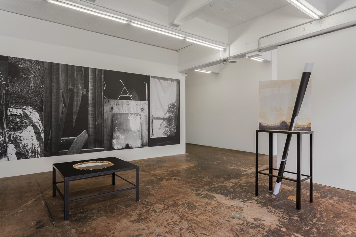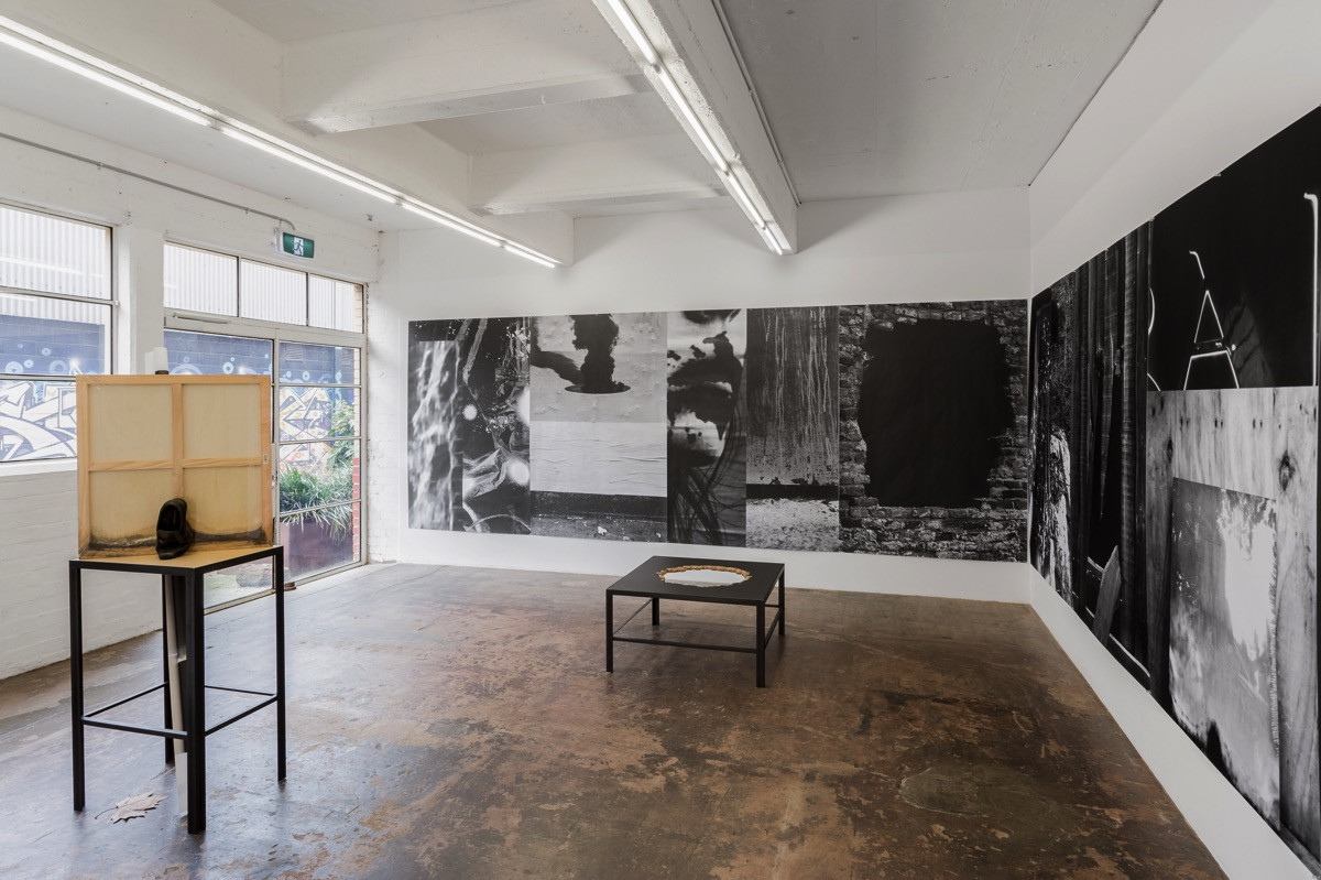 “Begins to Collapse” is an installation of photographic poster prints, exploring colliding imagery drawn from high and low cultural debris, anchored by a single sculptural assemblage. The work incorporates a complex photographic montage drawn from the surrounding peripheral environment. This chaotic landscape, alienated from the picturesque – is configured in the gallery as an immersive field, collapsing elements of the absurd, the formal and the poetic. Characteristic of his broader practice, and in part the way we experience the world, “Begins to Collapse” embraces the cryptic, odd and happenchance encounters with the everyday.