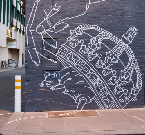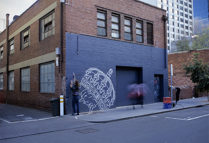 Buff Diss is a Melbourne based artist who specialises in creating works with masking tape. For a number of years Buff has been decorating the walls and laneways of Melbourne with his temporary and boldly unique form of art. This October, the tape will climb from the street to the gallery walls in his first solo show at Bus. The show is entitled ‘Buff vs. The Queen’, its works bringing to question the validity of the monarchy and the divinity it asserts.