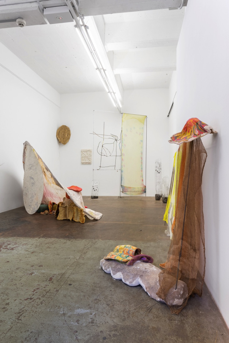 Flirtacious Energy embodies the coalescing of two distinctly experimental and material practices. Using the idea of ‘dressing’ or ‘undressing’ the gallery as a point of departure, each artist uniquely applies a sort of soft architecture to the body of the space. Thinking about the layering and accumulation of material on to and into the work through gesture, the show seeks to create a space that merges the intimate language of clothing and textiles with the structural, domestic codes of fixings. Pockets and pleats emerge as facultative accessories, ruching and dyeing become methods towards structural interventions.