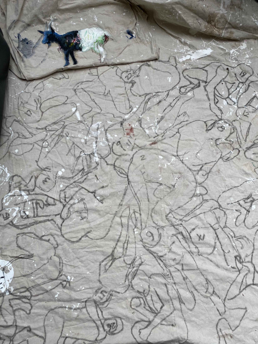 So the work that I’m doing for the show are all of these drop sheets for painting houses, some used some not. Im kinda stitching them all together but working on them separately beforehand to sketch the different panels out. And the panels are kinda as disparate in application/technique and subject as all the other shit I’ve been doing, there’s one thats like this nude model and its like 30 of him tumbling around and then another one is all animals and then theres one of objects and still lives etc…I’m frustrated about how to pull imagery together, not ideas idk, its hard to explain perhaps on the phone.
