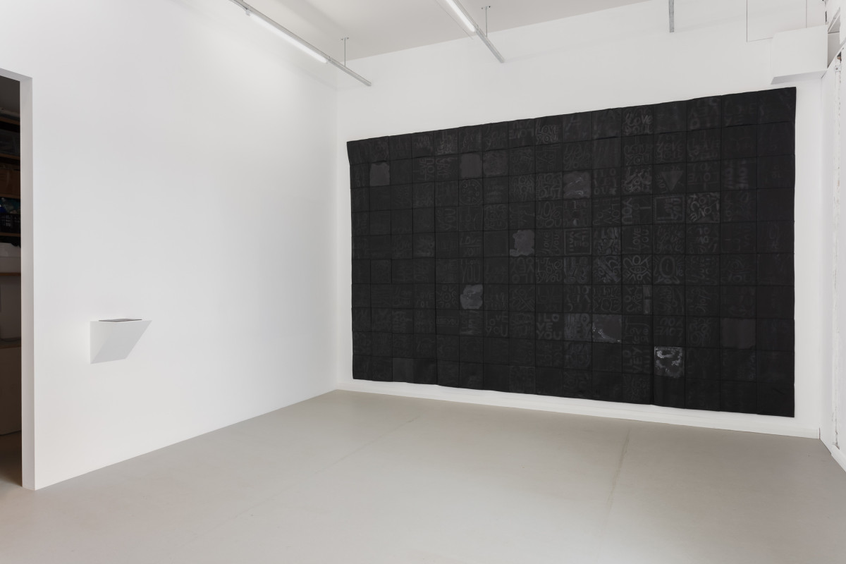 In Memory is inspired by the at once deeply personal and yet collectively shared experience of grief, loss and mourning. Monumental in scale, In Memory is made up of over 200 canvas squares cut to standard quilting size and sewn together to construct a large painting. Each square is intricately and individually designed using sign writing techniques, repetitive graphics and decorative motifs. Drawing on the tradition of mourning quilts; large handmade textiles to express and commemorate both personal and community grief, In Memory is a meditation on the complexity of grief, the inevitability of change and the ongoing process of life.