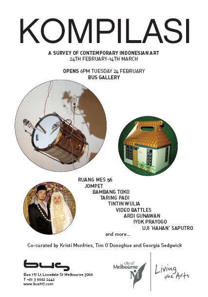 KOMPILASI draws upon the contemporary art scene of Yogyakarta, Bandung and Jakarta in Indonesia to present a diverse exhibition of photography, installation, sculpture, interactive art, video, film, drawing, sound, graphic/street art and product design. Co-curated by Kristi Monfries, Timothy O’Donoghue and Georgia Sedgwick with the assistance of the artists involved, the exhibition will he held at Bus Gallery, and will include a program of performances and artist’s talks as well as film screenings at Horse Bazaar and listening stations and product displays at Sunshine & Grease (a record shop located in Bus Gallery).