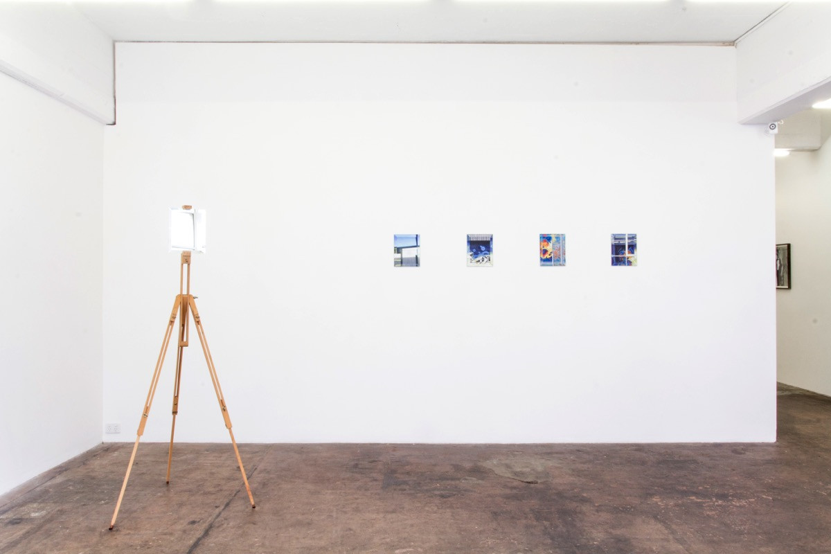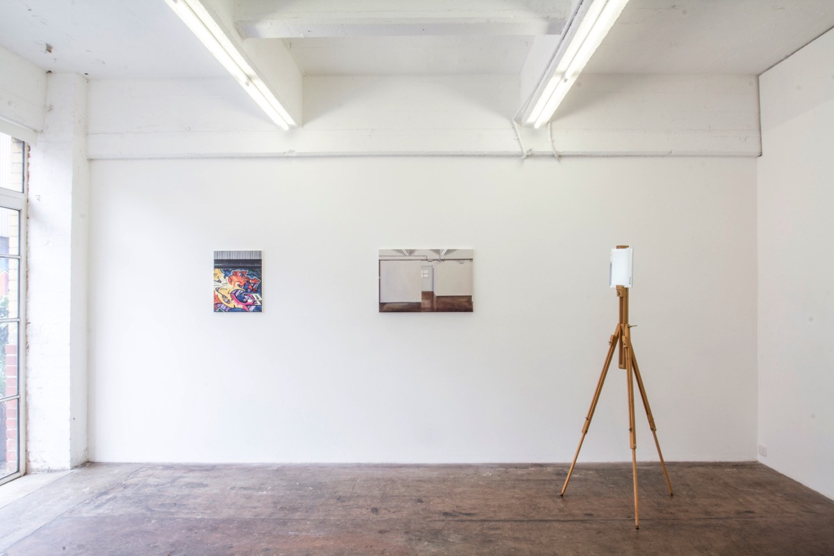 Composed of mirrors and trompe l’oeil paintings, this collaborative project aims to intervene in the site of Bus Projects and realign it as the subject for artistic production.