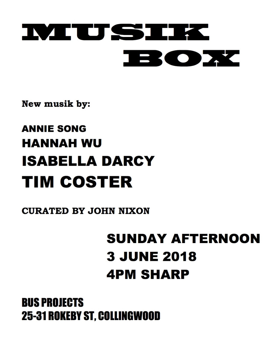 The concert also features three young artist musicians from Melbourne, from within my friendship group. Isabella Darcy is a member of The Donkey’s Tail, and Hannah Wu has recorded songs with The Donkey’s Tail. Annie Song released her debut vinyl record last year in an edition of two. Each of these performers has shown interest in presenting solo sets, and this will be their first public show.
