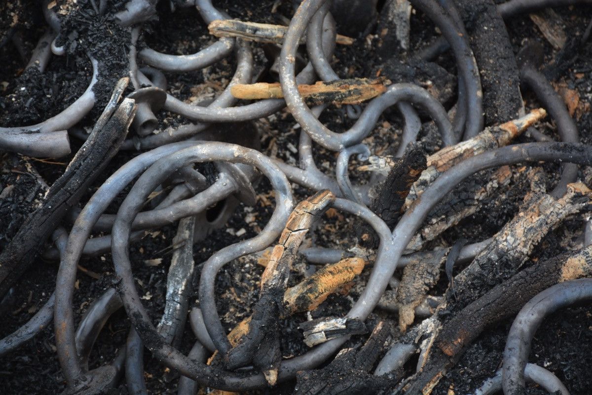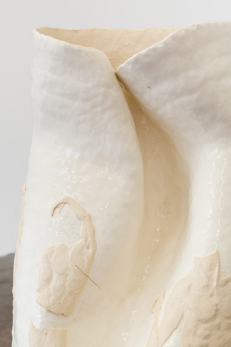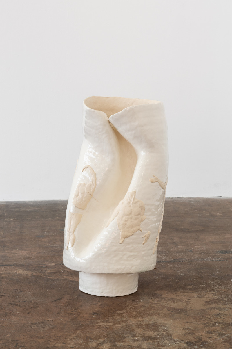 ‘Cooled pride, roused ardour’ investigates the artists queer identity through objects of personal worth. A pit-fired ceramic chandelier stands in for a body. A pair of high heeled boots sit nearby, their fabric taken from a family sofa, itself an old wedding present to his parents. On the floor, a pot depicting the martyrdom of St Sebastian is sheathed in a sacramental stole made by his mother.