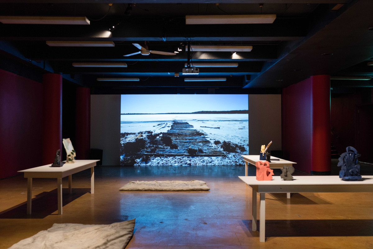 The exhibition includes a large scale video projection ‘The Spectral Field’ by Polly Stanton, a moving image and sound work that traces the delicate and hidden aspects of the ancient Mallee landscape. By documenting the land through cinemas ability to look and listen, the work considers the Mallee as a hauntological space that is both material and meditated. Alongside this sit a series of ceramic sculptures crafted by Kate Tucker. These handcrafted organic forms reference hand gestures from instruction manuals — illustrating notions of care both to oneself and to another. A collection of hand dyed pillow works by Katie West lay on the floor. These cushions are filled with hessian from an unknown source, and eucalyptus and banksia leaves collected on Lutruwita. Their repurposed fabric coverings are dyed with eucalyptus leaves collected in Naarm. They are an offering of a place for human bodies to rest and be with others.