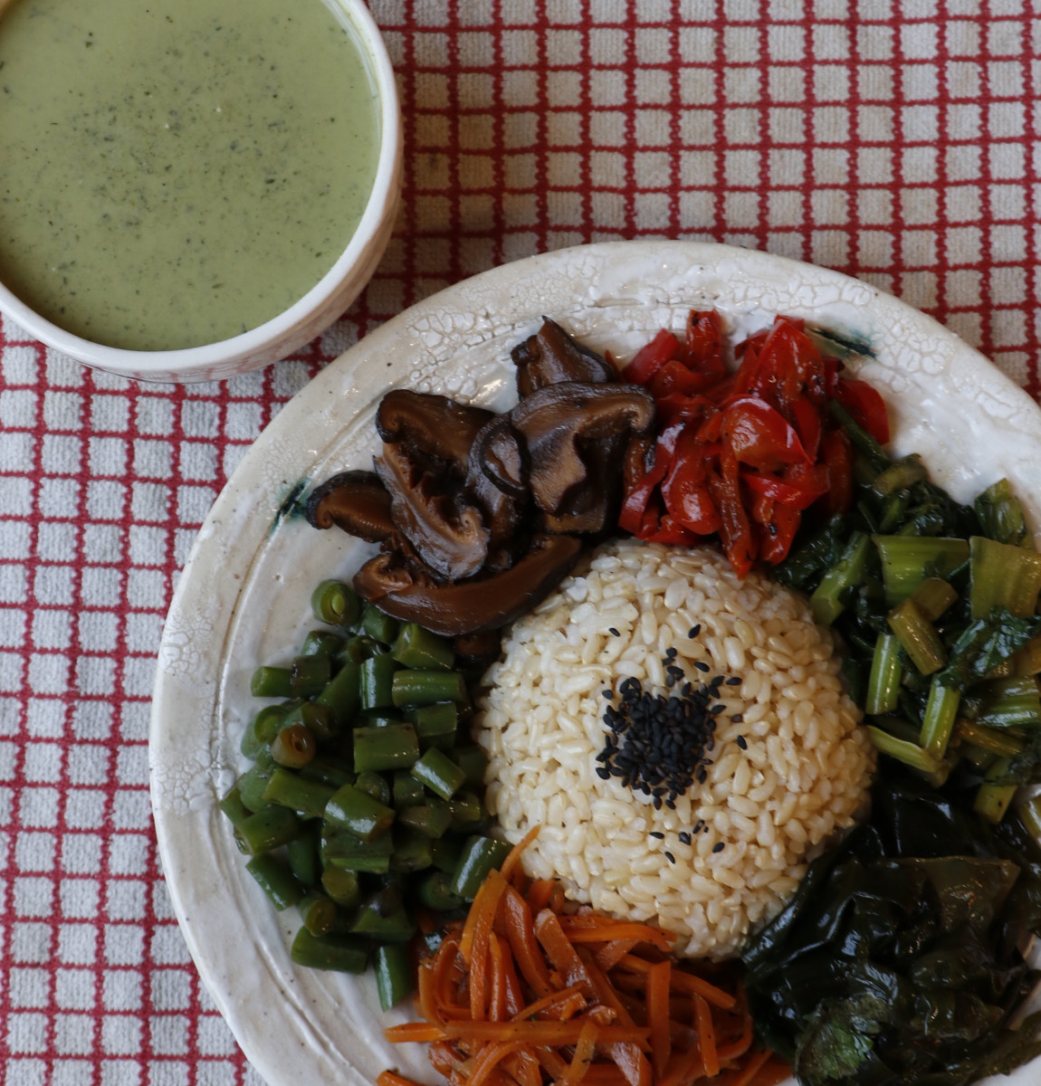 擂茶 Lei Cha is a vegan Hakka dish supposedly originating in from the Three Kingdoms period. The preparation, plating and absence of meat suggests that it is informed by buddhist practice. It is simple and methodical to prepare, however each vegetable is sliced and cooked individually, which is time consuming. The “tea” has a minimum of seven herbs blended together. Some people may find that the tea has a bitter taste, this is normal. Bitterness is an essential part of Chinese cuisine, it cleanses the palate and is also believed to help remove toxins from the body.