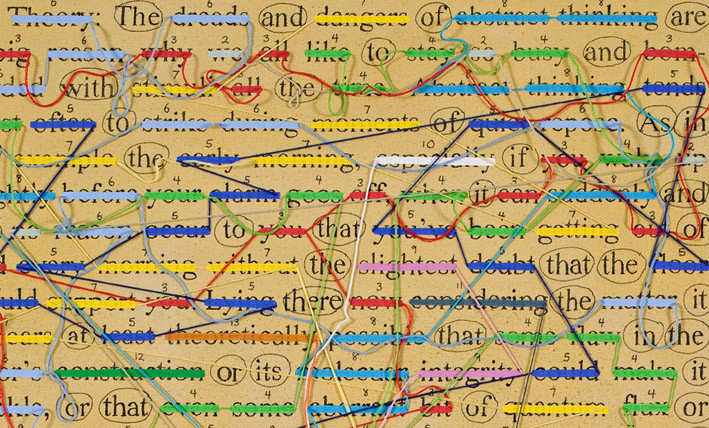 From these uncertain beginnings, Claire has constructed a series of works on canvas that adopt the format of pages of a book. In these over-size versions, the text is subjected to a series of lo-fi ‘information processing’ systems, variously circled, numbered, annotated, categorised, painted-out and looped together with thread, creating a frenetic mass of dysfunctional classification, and generating a multi-coloured visual field.
