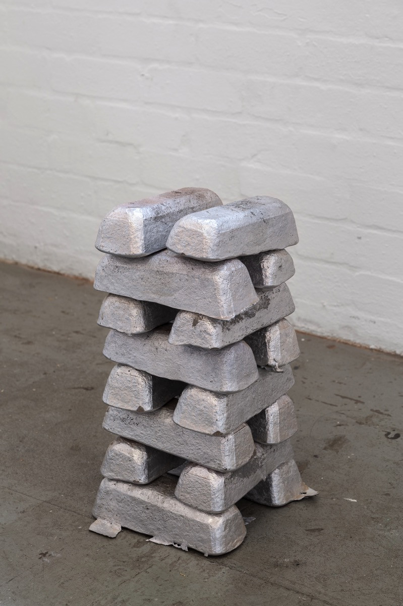 The work exhibited at Bus Projects is Part 3 of ‘Limits to Growth’. With development of new sculptural forms, Nicholas Mangan continues to explore the themes of circular economies. By manually breaking down the components of the now obsolete Bitcoin mining machines used in the first two stages of the project the artist created aluminium bullions of recycled “e waste” which act as a new hard currency. In addition, the cut wires from the mining rigs can be read as transmitters of energy and currency flows, a residual material connecting the three parts of the project.
