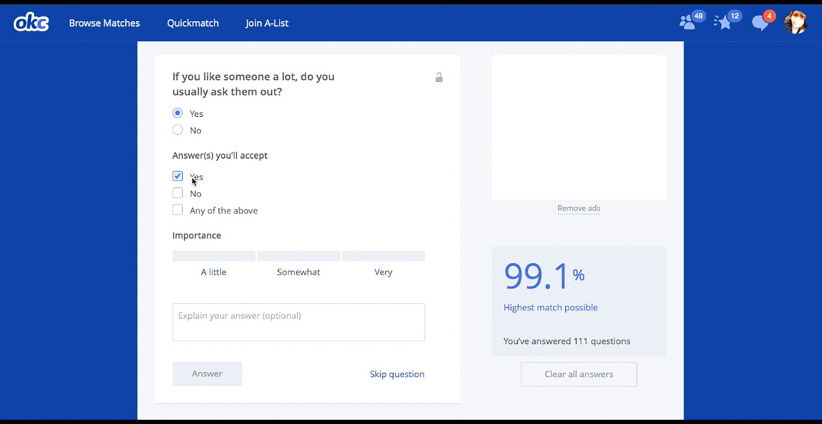 Self Portrait as OkCupid Questionnaire is a screen recording of artist Carla Adams typing answers to questions that form part of the ‘match survey’ on dating website OkCupid.com