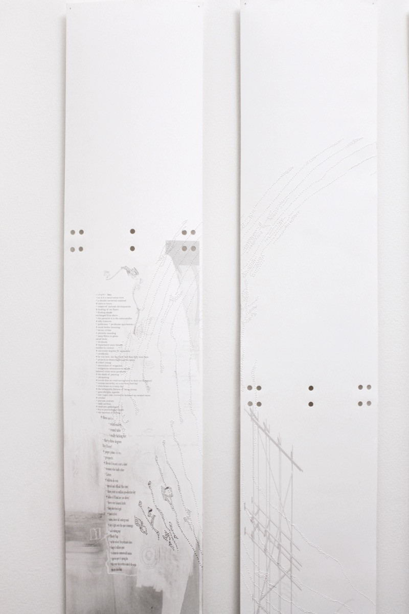 Hill draws on a repeated ritual of her practice in which vocabularies of marks are stored through the incidental rubbing of copper plates located in her backpack during walks. This series aligns to Bogong Village, Victoria where she recently undertook a residency. For Kotlarczyk, traditions of marginalia and research into the body politic inform a suite of sculptural, contoured visual poems that notate responses to various public conversations being had over a five-month period is 2015-16.