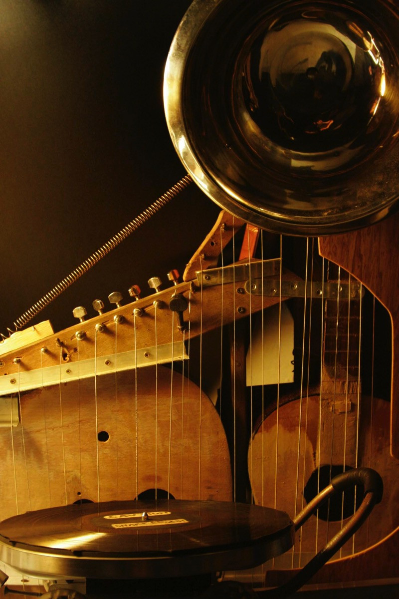 Wood, steel, aluminium, plastic, rollerblade wheels, bicycle bell, air mattress pump, recorder mouth piece, mixing bowl, guitar bodies, biscuit tin, transducer, guitar pickups, ball bearing, egg ring, springs, door knob, music box tines, machine heads, bamboo, brass horn, guitar strings, bass string, violin string, zither strings, piano wire, hose clamps, sticky tape, fabric, LP vinyls.