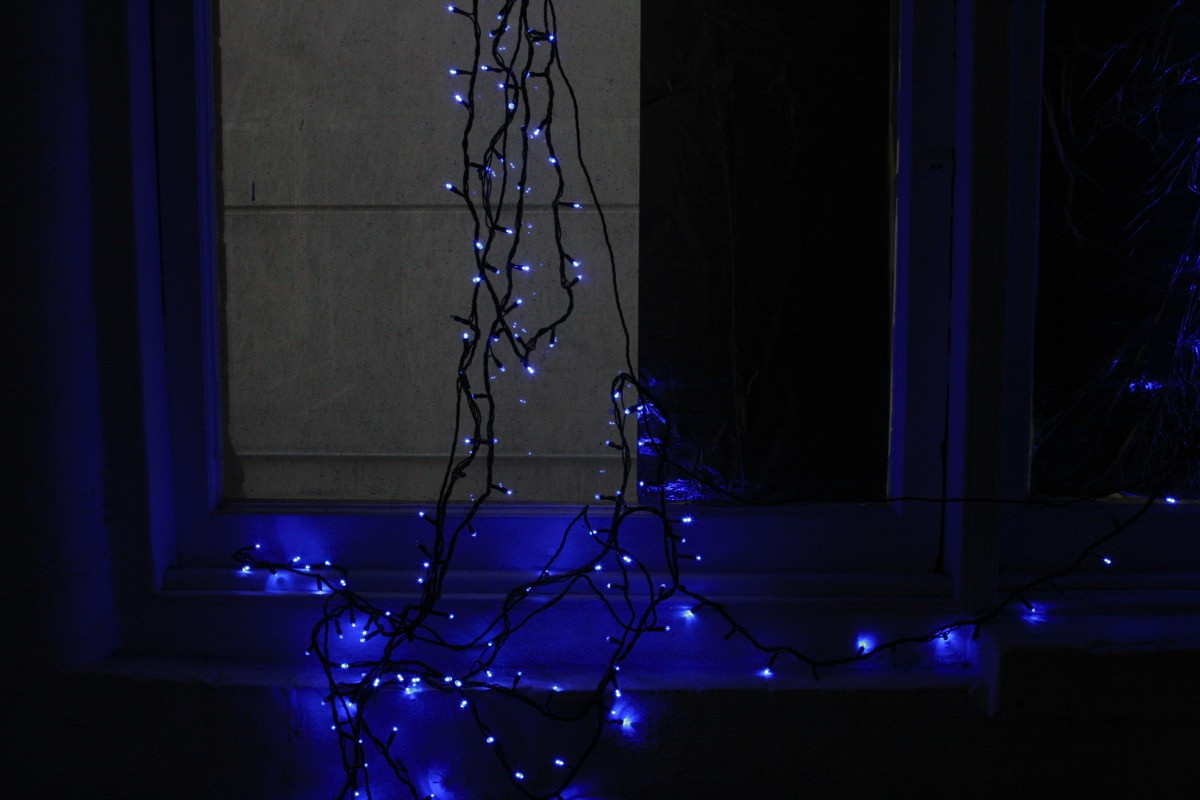Piano wire, steel cable, cello bows, nylon filament, blown glass, water, wall fixtures and sound equipment.