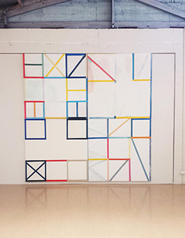 Within the active field of each painting, box like zones are articulated. Line work such as bordering and edging carve into what was once an open field, implying territories- “This” is “Here” and “That” is “There”, yet the specificity, the (figurative) ‘content’ of “This” and “That” are constantly deferred. This connects the work to a kind of abstraction also occurring within thought and language. We use words such as “This” and “There” in much the same way as we use ‘boxes’ and ‘zones’ – as placeholders that can be both vague and certain. Whilst the paintings are definitive via delegation of zone and area, there is also a looming non-specificity that is key to the reading of the works. Fibrillating between most definitive marks (the order) and the vague or non-specific (content), the surface of the works become unstable domains, holding interesting links that might add to our understanding of abstraction, cognition and sensation (forms of abstract thought).