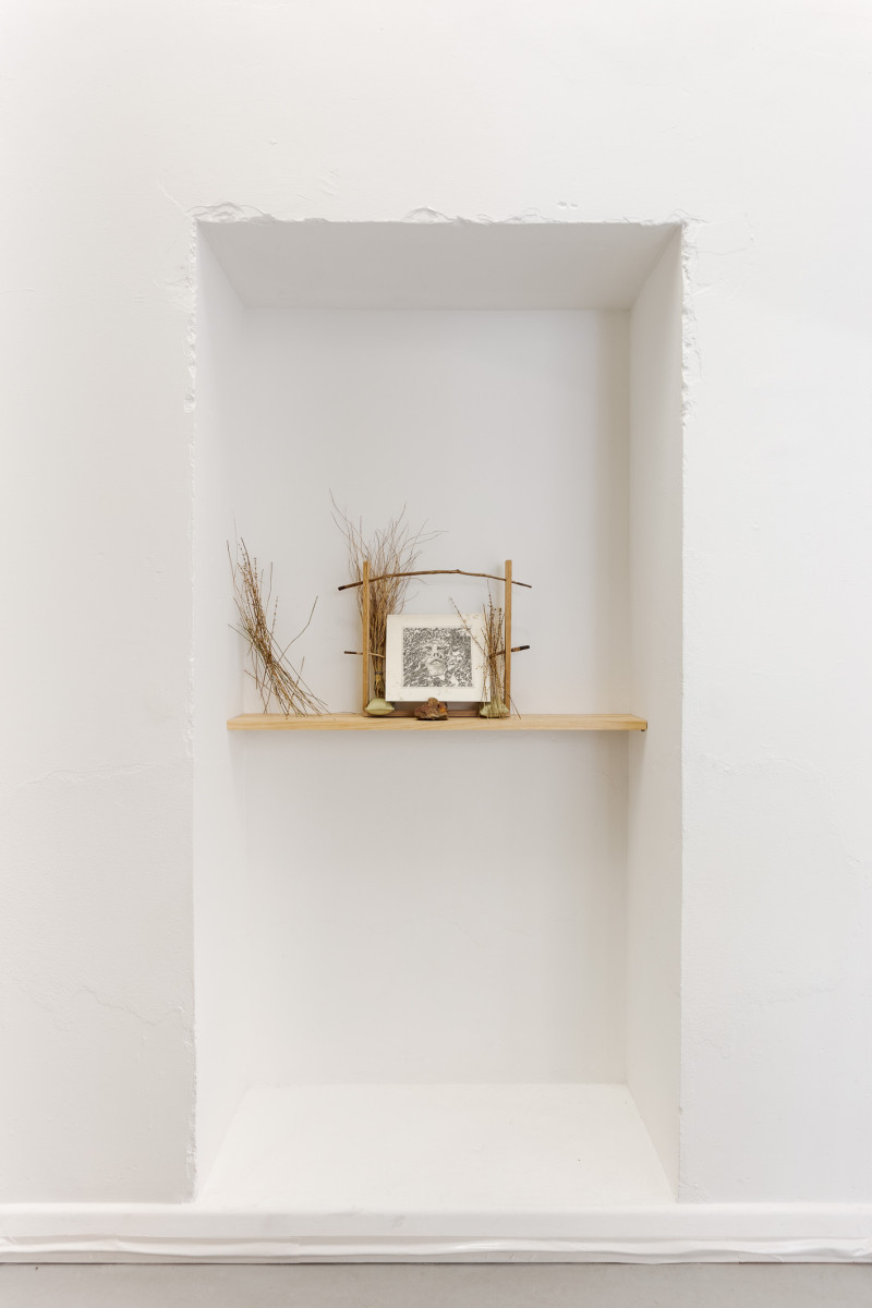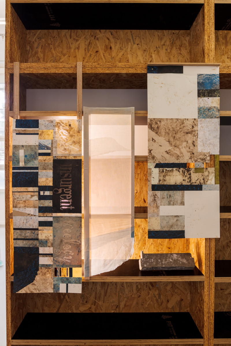 As a site of intergenerational and material recuperation, this exhibition honours the artist’s grandfather’s labours during those years: of hands immersed in earth; of diligent tasks of stitching, incorporating, building. Against this history of brutal enforced labours rendering tyrannical monuments, these renditions envision new blueprints that dwell in the soft bodies of local Merri Creek clays and their vegetal and bacterial kin, as found around the artist’s home in Fawkner. Impressions of these bodies carried through papers and gum arabic polymer both support and affectively divest from the holding of hard, intrusive rock used to fortify the colonial settler state of so-called Australia—the land to which Antoni migrated in 1949—thereby also foregrounding the difficult histories of our current sites for knowledge production.