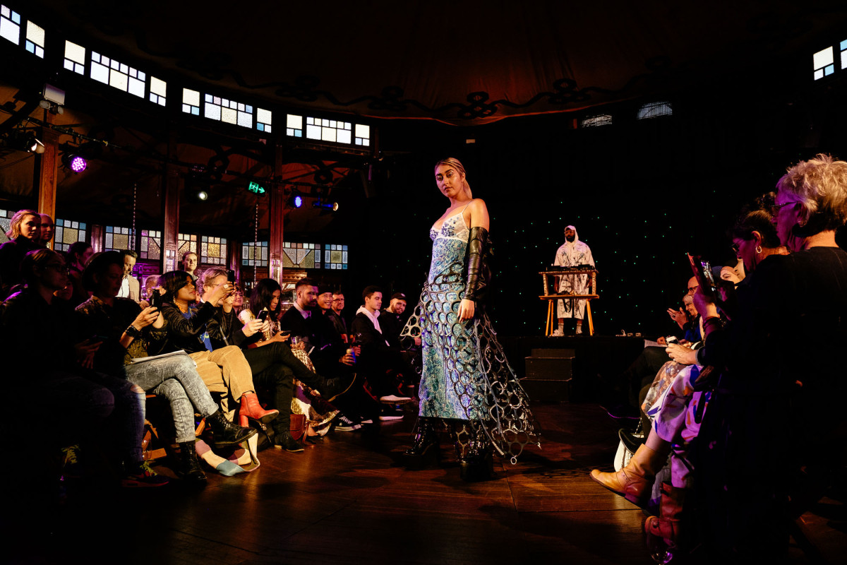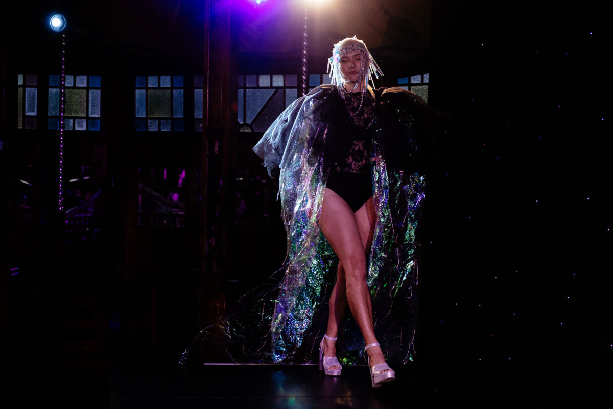 ‘Water is the driving force of all nature’. In this piece we explore water and its relationship with us from birth, we begin our lives from the sacred watering hole of our mothers belly. The power of water is vital to our everyday lives and the existence on this earth. Using up-cycled plastics we have created a ‘Mother of Water’ cape which has drops of water connected to an iridescent sheet of fabric. Black tulle shoulder accents to show strength and a beautiful Warrior goddess headpiece made from recycled pieces of iridescent acrylic.