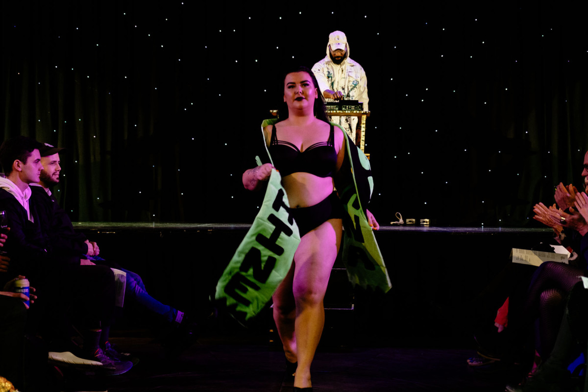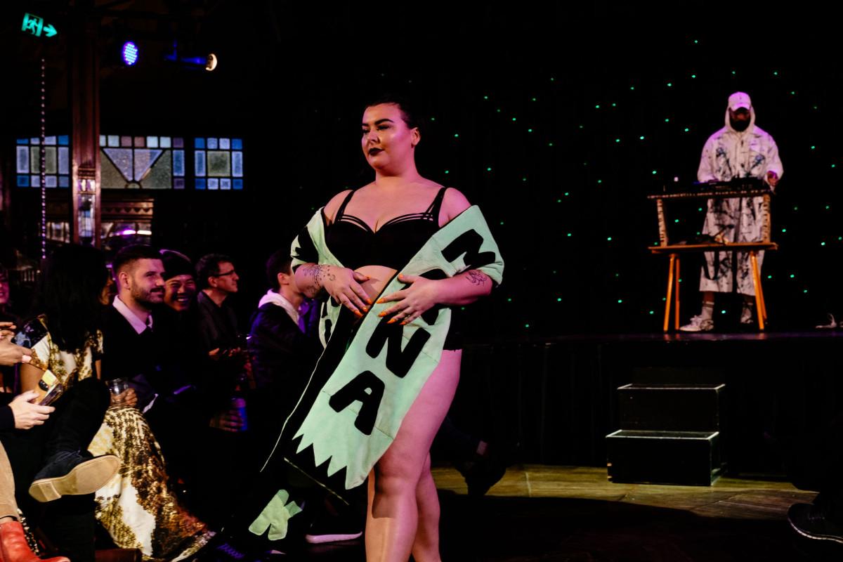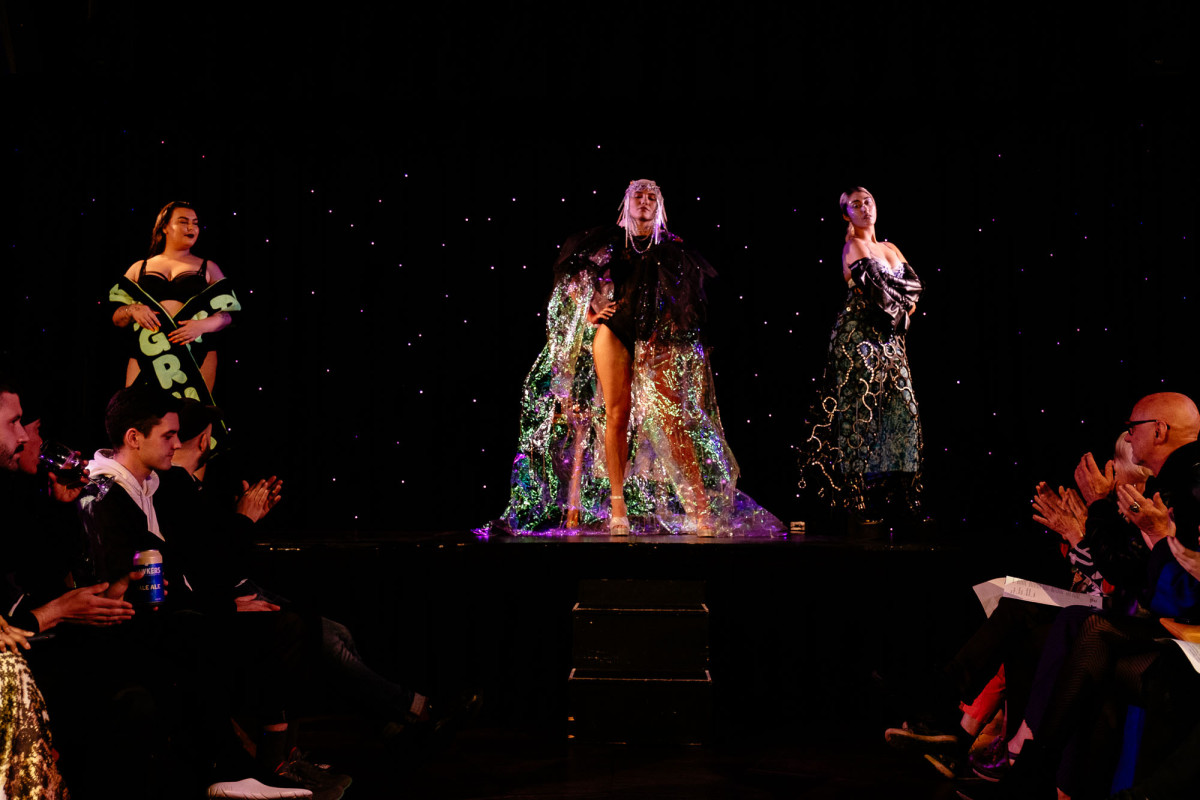 Dreaming’ printed on a delicate silk chiffon dress, hand painted laser-cut neoprene sourced from mass produced stubby-holder manufacturers to form a structured skirt overlay, ruffled latex gloves from dead-stock material as well as hand-embellished lingerie.