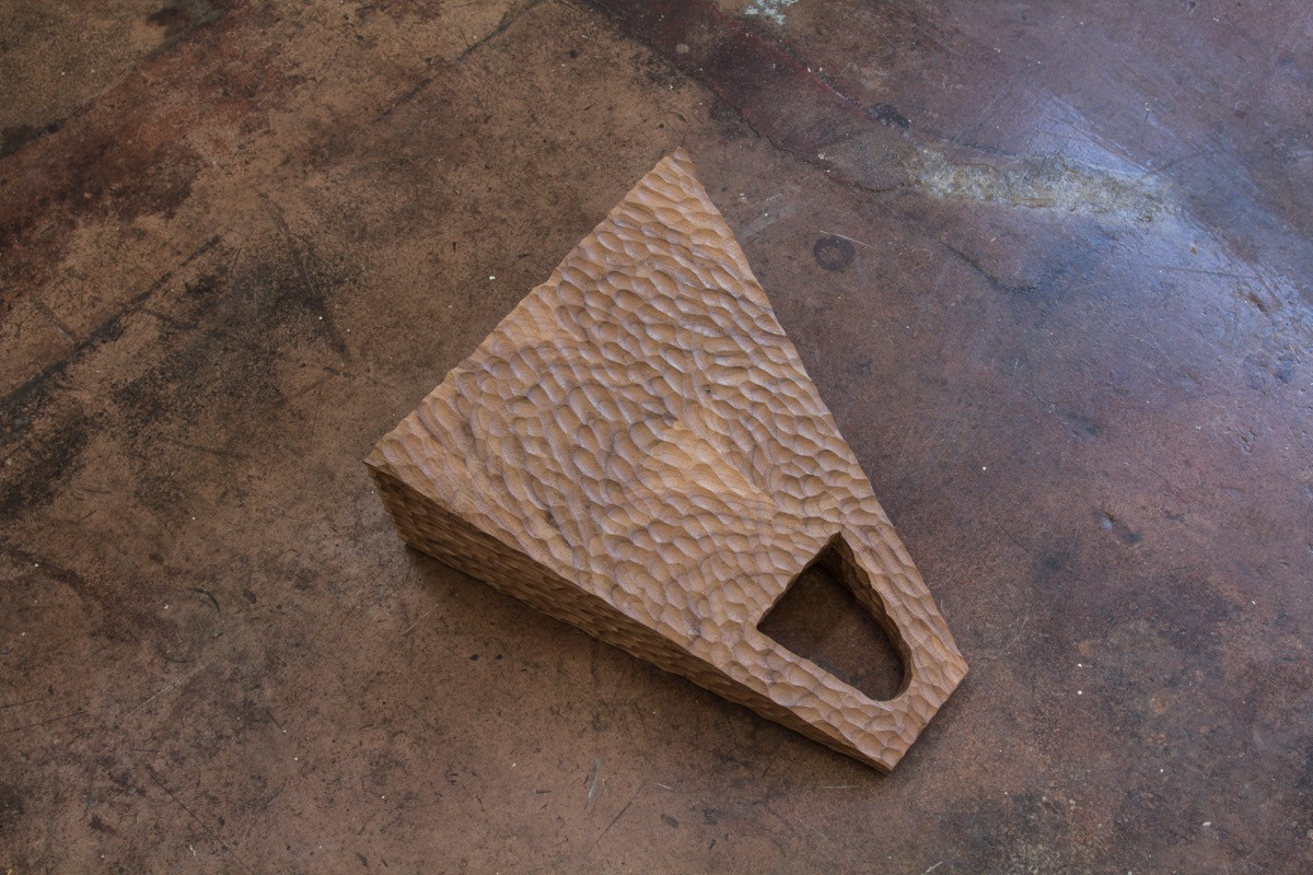 A wood carving of a handbag prefigures both the means of procurement and the coveted thing-in-itself. But also, Winnicott’s idea that the delinquent child doesn’t want the things she steals so much as, “that [s]he is looking for something that [s]he has a right to”; intent on clawing back the lost object. Each proposes material violence, describing form through accumulative depletion.